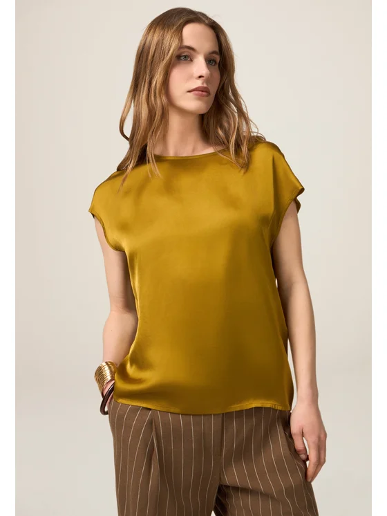 Blusa realizzata in fluido raso 100% viscosa; vestibilità regular, scollatura tonda; maniche corte a kimono, apertura a goccia con bottone sulla schiena; MADE IN ITALY.