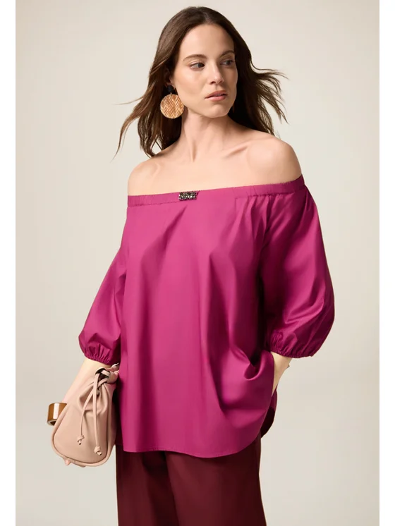 Blusa realizzata in popeline 100% cotone; vestibilità over con scollatura off shoulders; maniche a tre quarti con polsini elasticizzati, dettaglio gioiello sulla scollatura.