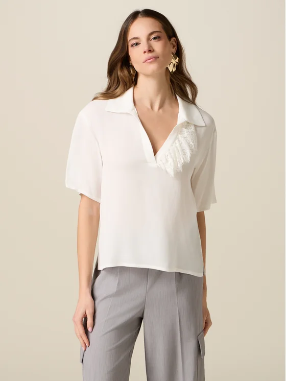 Blusa in fluido tessuto crêpe di viscosa; rouche in pizzo; maniche corte e colletto classico; MADE IN ITALY.