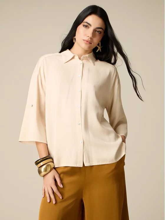 Camicia in fluido tessuto di lyocell, viscosa e lino; chiusura con bottoni frontali; colletto classico, maniche a tre quarti con patta e bottone per raccorciarle, soffietto sul retro; MADE IN ITALY.