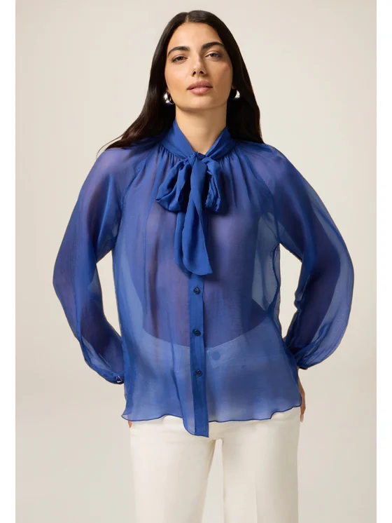 Blusa realizzata in fluido voile misto seta; vestibilità ampia con chiusura frontale a bottoni; scollatura con fiocco da annodare a fiocco; MADE IN ITALY.