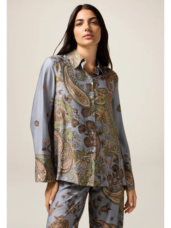 Camicia in raso di viscosa fantasia; vestibilità regolare con chiusura frontale a bottoni; colletto classico e maniche lunghe, possibilità di abbinarla ai pantaloni coordinati; MADE IN ITALY.