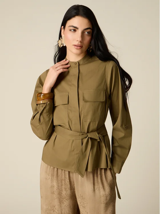 Camicia realizzata in popeline misto cotone; vita con arricciature dietro e cintura da annodare; collo alla coreana, maniche lunghe e tasche applicate sul davanti.