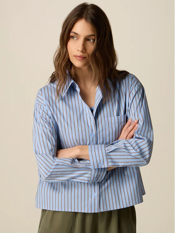 Camicia in popeline misto cotone; vestibilità oversize con taglio cropped e chiusura frontale a bottoni; colletto classico, maniche lunghe con polsini abbottonati e taschino applicato sul petto; MADE IN ITALY.