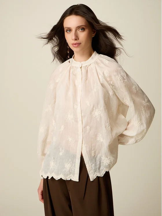 Blusa in mussola misto lino con ricami all over; chiusura con abbottonatura frontale; collo alla coreana, maniche lunghe a palloncino e orlo inferiore smerlato; MADE IN ITALY.