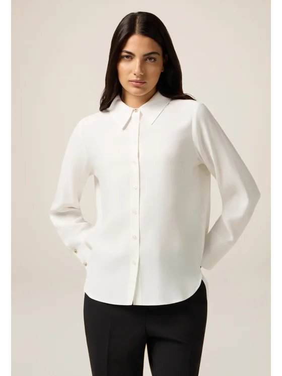 Camicia realizzata in fluida viscosa crêpe; vestibilità regular con chiusura frontale a bottoni; colletto classico, maniche lunghe con polsini.