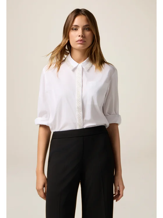 Camicia realizzata in popeline 100% cotone; chiusura frontale a bottoni; ricamo in perline e canottiglie sul colletto e lungo l'abbottonatura.