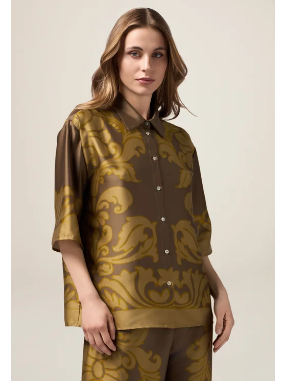 Camicia realizzata in fluido raso fantasia; linea dritta, maniche a tre quarti e chiusura frontale con bottoni; colletto classico, orlo dritto sul fondo. Possibilità di abbinarla ai pantaloni coordinati; MADE IN ITALY.