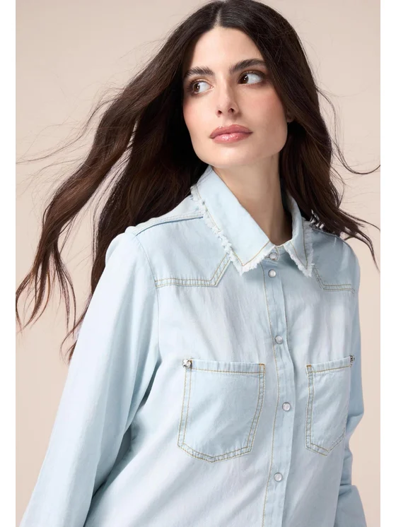 Camicia realizzata in leggero denim stone bleached; orli sfrangiati, taschini applicati davanti; chiusura a bottoni automatici e dettaglio di pietre crystal; MADE IN ITALY.