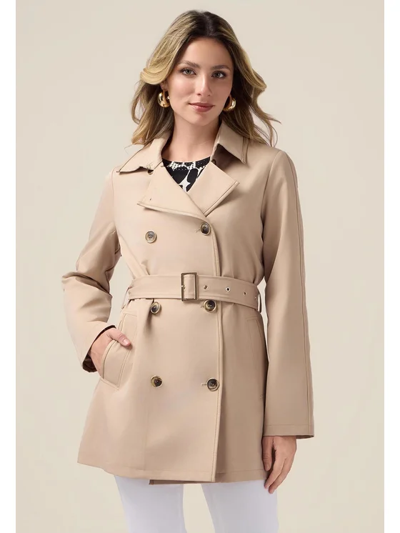 Trench midi realizzato in tessuto tecnico tinta unita; chiusura doppiopetto a bottoni screziati con ghiera metallica; cintura da stringere in vita, tasche davanti, martingala dietro con bottone; profili in tessuto spalmato tono su tono.