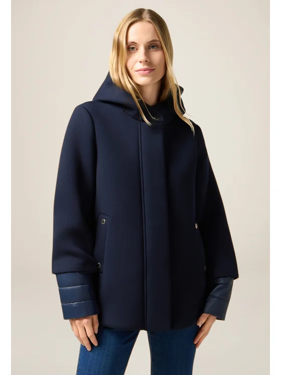 Giubbotto realizzato in tessuto scuba con cappuccio; lunghezza media, chiusura con bottoni e zip nascosta; maniche lunghe con manicotti in nylon trapuntato, removibili, e tasche laterali con bottoni a pressione.