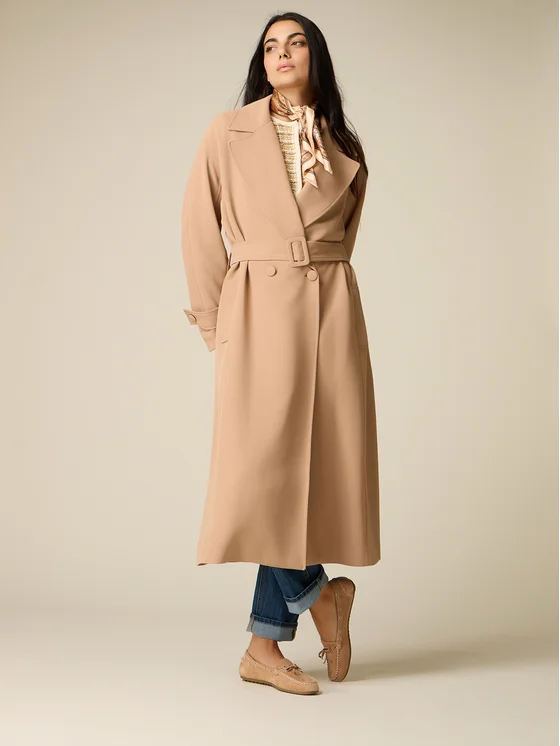 Trench lungo realizzato in tessuto fluido; chiusura doppiopetto a bottoni foderati e cintura con fibbia da stringere in vita; revers ampi, maniche lunghe cinturini sul fondo, tasche sui fianchi e spacco posteriore centrale.; MADE IN ITALY. Si consiglia di acquistare una taglia in meno rispetto a quella abituale.