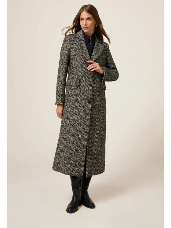 Cappotto lungo in tessuto spigato; modello monopetto con chiusura frontale a bottoni; maniche lunghe, tasche laterali e revers classici; MADE IN ITALY.