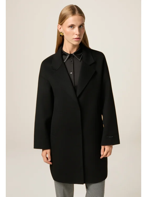 Cappotto in tessuto double misto lana; vestibilità cocoon con chiusura monopetto a bottoni nascosti; maniche a tre quarti e tasche a filetto.