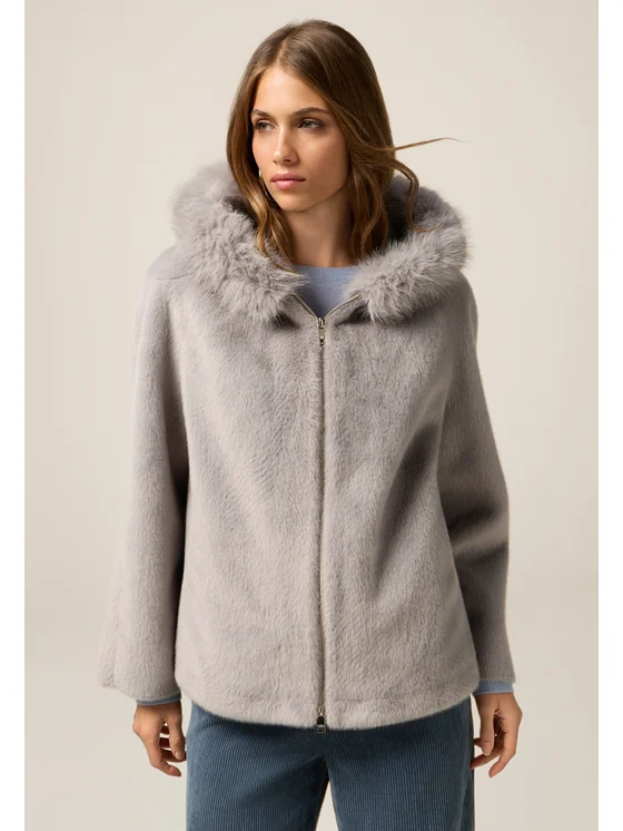 Giubbotto realizzato in soffice tessuto effetto peluche; modello corto con cappuccio; tasche all'americana davanti, maniche lunghe e chiusura frontale a zip.