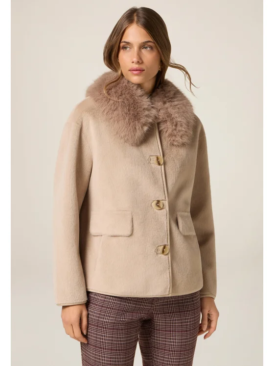 Cappotto corto realizzato in panno tinta unita; modello corto con chiusura monopetto a bottoni screziati; maniche lunghe e tasche a patta davanti.