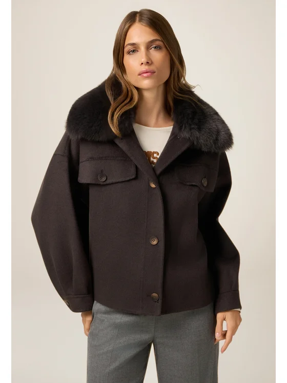 Cappotto corto realizzato in tessuto misto lana; modello corto con chiusura monopetto a bottoni screziati; due tasche a patta davanti, colletto effetto peluche, removibile.