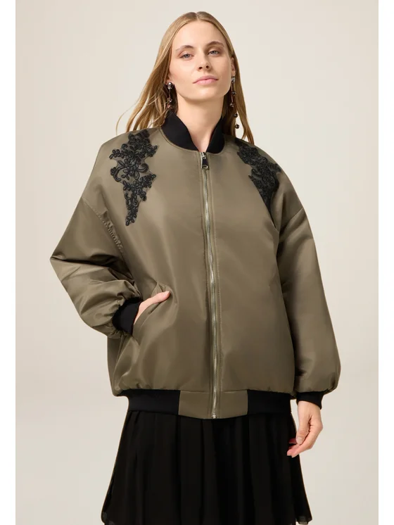 Bomber realizzato in raso; linea over, chiusura frontale a zip metallica; maniche lunghe, tasche laterali, patch decorativi sulla parte alta; polsini e bordo inferiore a coste, in contrasto. MADE IN ITALY.