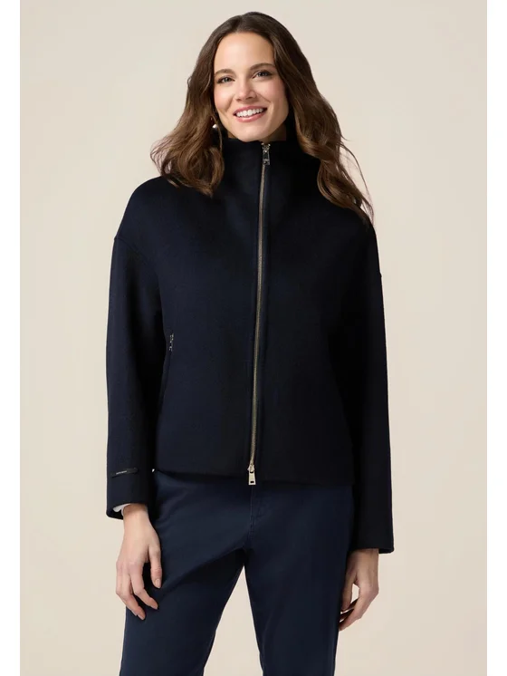 Giubbotto realizzato in panno double misto lana; chiusura a zip metallica davanti; bordo stondato, tasche davanti; CAPO CUCITO A MANO.