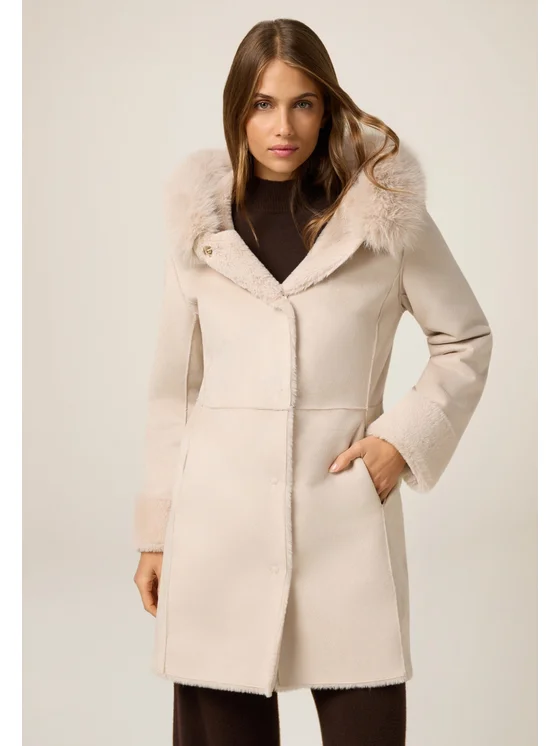 Cappotto realizzato in morbido tessuto con caldo interno peloso; lunghezza media con chiusura a bottoni automatici; cappuccio e maniche lunghe con bordi pelosi, tasche all'americana davanti.