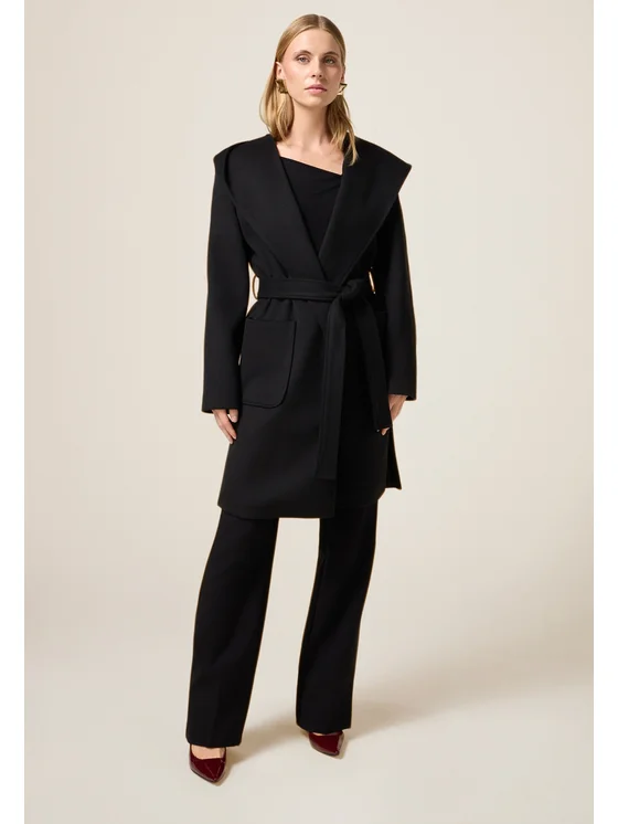 Cappotto realizzato in panno di poliviscosa con cappuccio; lunghezza media, chiusura con cintura da annodare in vita; maniche lunghe, tasche a patta davanti; MADE IN ITALY.