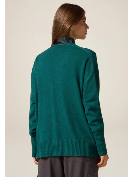 Cardigan realizzato in filato misto viscosa; lunghezza media, scollatura a V profonda, chiusura frontale con bottoni dorati; maniche lunghe, bordi a coste sul fondo e sui polsini; MADE IN ITALY.