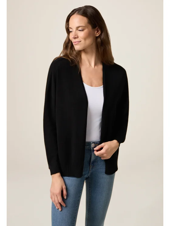 Cardigan realizzato in filato misto viscosa tinta unita; lunghezza media, vestibilità regolare, apertura frontale senza chiusura; MADE IN ITALY.