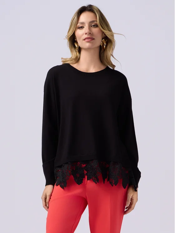 Maglia realizzata in filato misto viscosa; inserto in pizzo macramé sul fondo; scollatura tonda e maniche lunghe.