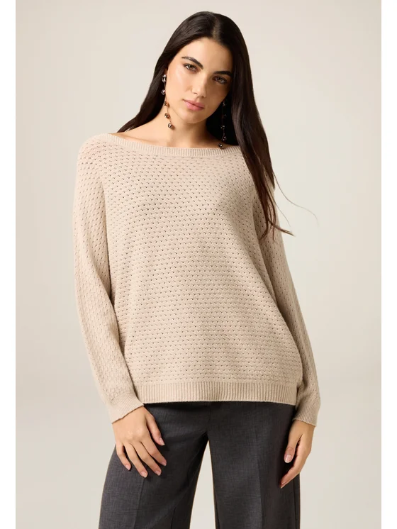 Maglia realizzata in filato misto viscosa; lunghezza media, scollatura a barchetta; maniche lunghe, lavorazione traforata; MADE IN ITALY.