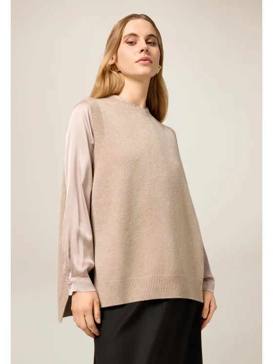 Maglia senza maniche realizzata in filato misto viscosa; linea over, scollatura tonda; spacchi laterali sul fondo; MADE IN ITALY.