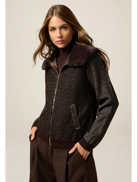 Cardigan effetto bomber realizzato in filato misto lana con intervento di filo lurex; modello corto con chiusura a zip frontale; colletto con applicazione in tessuto effetto peluche, tasche all'americana davanti; MADE IN ITALY.