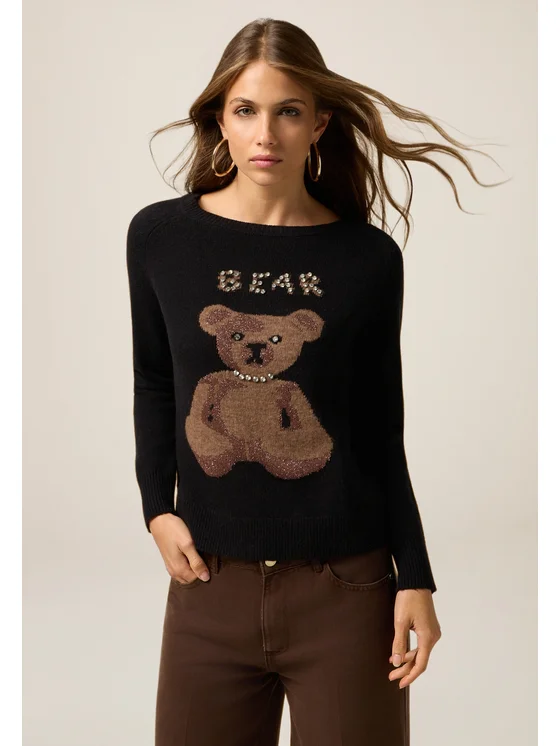 Maglia girocollo realizzata in filato misto lana; maniche lunghe, scollatura tonda; motivo jacquard impreziosito da castoni crystal.