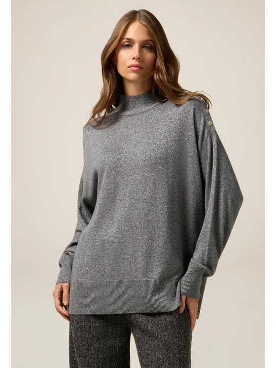 Maglia realizzata in filato misto cashmere con inserto di filo lurex; lunghezza media con scollatura dolcevita; dettaglio di bottoni sulle spalle.
