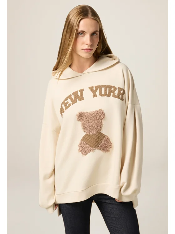 Felpa chiusa in tessuto misto cotone con cappuccio; vestibilità ampia con maniche lunghe; applicazione frontale con scritta patchwork; MADE IN ITALY.