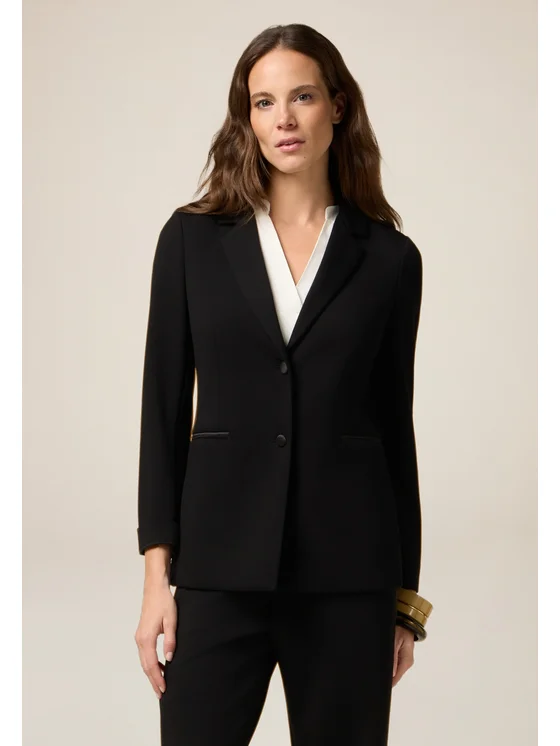 Giacca realizzata in tessuto scuba misto viscosa; vestibilità regular con chiusura monopetto a bottoni; maniche lunghe, tasche a filetto con profilo.