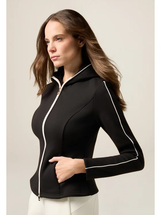 Felpa realizzata in tessuto scuba stretch; cappuccio, chiusura a zip davanti, profili a contrasto colore; interno in caldo tessuto peloso.