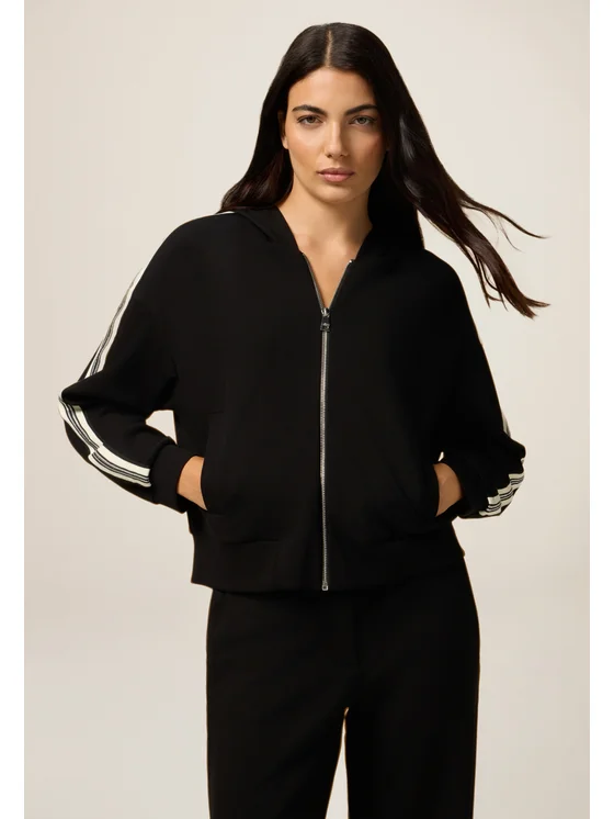 Felpa realizzata in fluido tessuto misto viscosa; vestibilità regular con chiusura frontale a zip e cappuccio; tape bicolor laterale; coordinabile con pantaloni abbinati