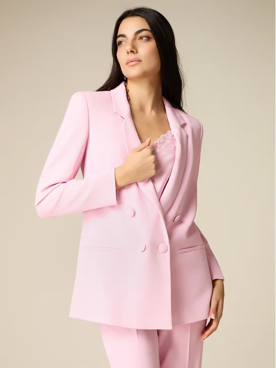 Giacca blazer strutturata realizzata in tessuto crêpe; linea media, chiusura doppiopetto con bottoni rivestiti; maniche lunghe, tasche a filetto davanti, spacco centrale sul fondo, dietro e fodera interna tono su tono; possibilità di abbinarla ai pantaloni coordinati.