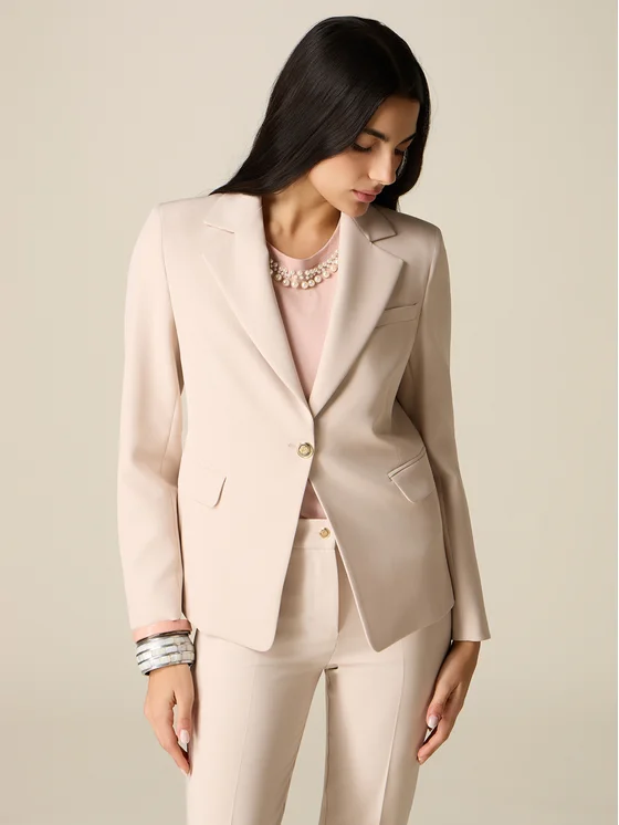 Giacca blazer realizzata in tessuto tecnico stretch; linea classica con fodera interna e chiusura monopetto a singolo bottone in stile araldica; tasche a patta davanti, maniche lunghe con dettaglio di bottoni decorativi sul polso; possibilità di abbinarli ai pantaloni coordinati. MADE IN ITALY.