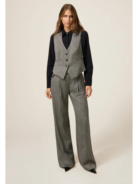 Gilet in flanella di poliviscosa a fantasia gessata; modello corto con chiusura monopetto a tre bottoni; scollo a V profondo, tasche a filetto sui fianchi, possibilità di abbinarlo ai pantaloni coordinati; MADE IN ITALY.