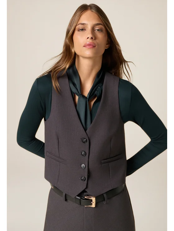 Gilet realizzato in flanella di poliviscosa; modello corto con chiusura monopetto a quattro bottoni; scollo a V profondo e design senza maniche, possibilità di abbinarlo alla gonna coordinata; MADE IN ITALY.