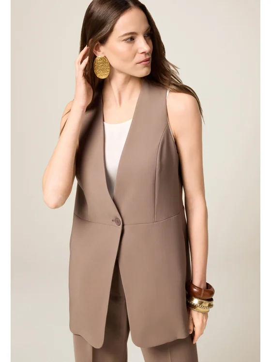 Gilet realizzato in tessuto misto viscosa; fodera interna a contrasto colore, chiusura a bottone unico; possibilità di abbinarlo ai pantaloni coordinati; MADE IN ITALY.