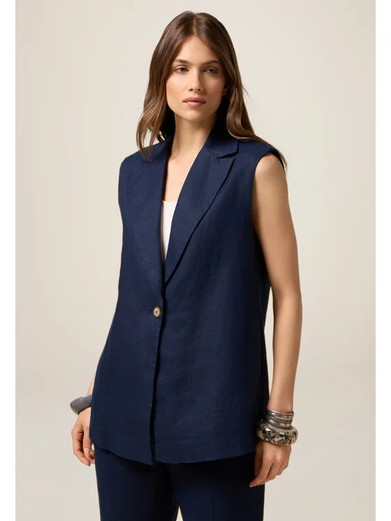 Gilet in fresco tessuto 100% lino; lunghezza media, chiusura monopetto con un singolo bottone; colletto a revers classico.