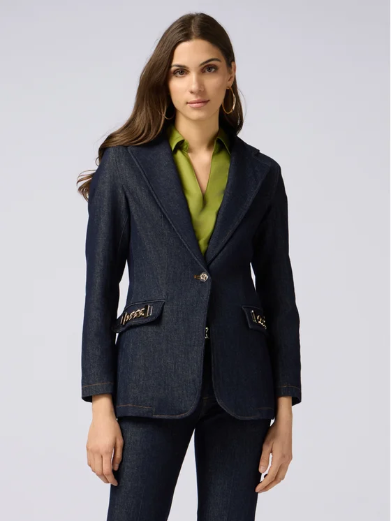 Blazer realizzato in denim di cotone blu scuro rinse; lunghezza media, chiusura monopetto a singolo bottone; maniche lunghe, tasche a patta con catene metalliche decorative.