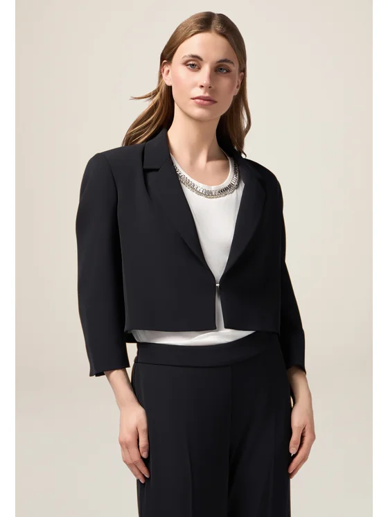 Giacca blazer realizzata in tessuto fluido; linea cropped, design monopetto; chiusura a gancio davanti, maniche a tre quarti.