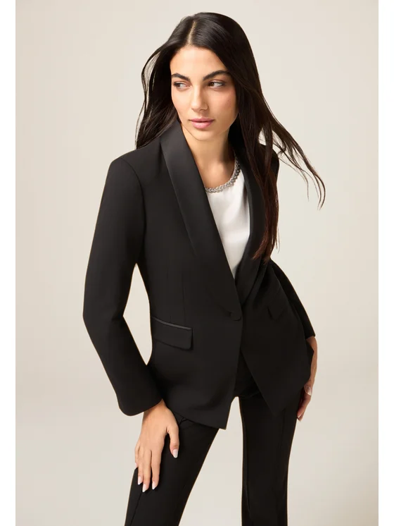 Giacca blazer realizzata in fluido tessuto crêpe; chiusura monopetto a bottone foderato, tasche a patta davanti; revers in raso; possibilità di abbinarla ai pantaloni coordinati.