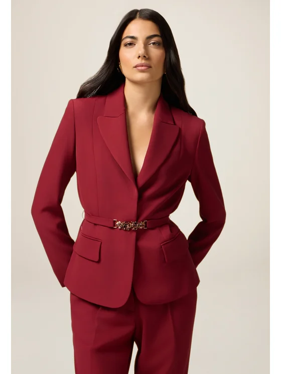 Blazer realizzato in cady enverse satin; lunghezza media, tasche a patta davanti; maniche lunghe, cintura gioiello da stringere in vita; possibilità di abbinarlo ai pantaloni coordinati. Il capo ha una vestibilità ristretta, si consiglia di acquistare una taglia in più.