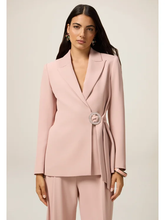 Blazer realizzato in fluido tessuto; chiusura asimmetrica con tape in raso e fibbia gioiello; possibilità di abbinarlo ai pantaloni coordinati.