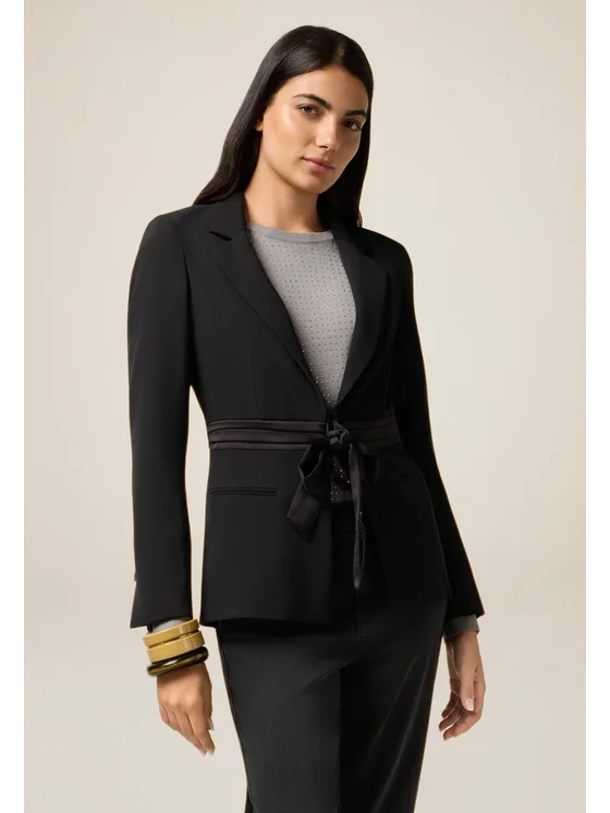 Blazer realizzato in cady; cintura in raso da annodare in vita; maniche lunghe, revers classico, finte tasche a filetto e fodera interna; il capo ha una vestibilità ridotta, si consiglia di acquistare un taglia in più.