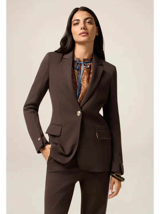 Blazer realizzato in confortevole jersey punto milano; chiusura monopetto con bottone singolo dorato, tasche a patta davanti; maniche lunghe con bottoni decorativi sui polsini, spacco centrale sul retro; possibilità di abbinarlo ai pantaloni coordinati.